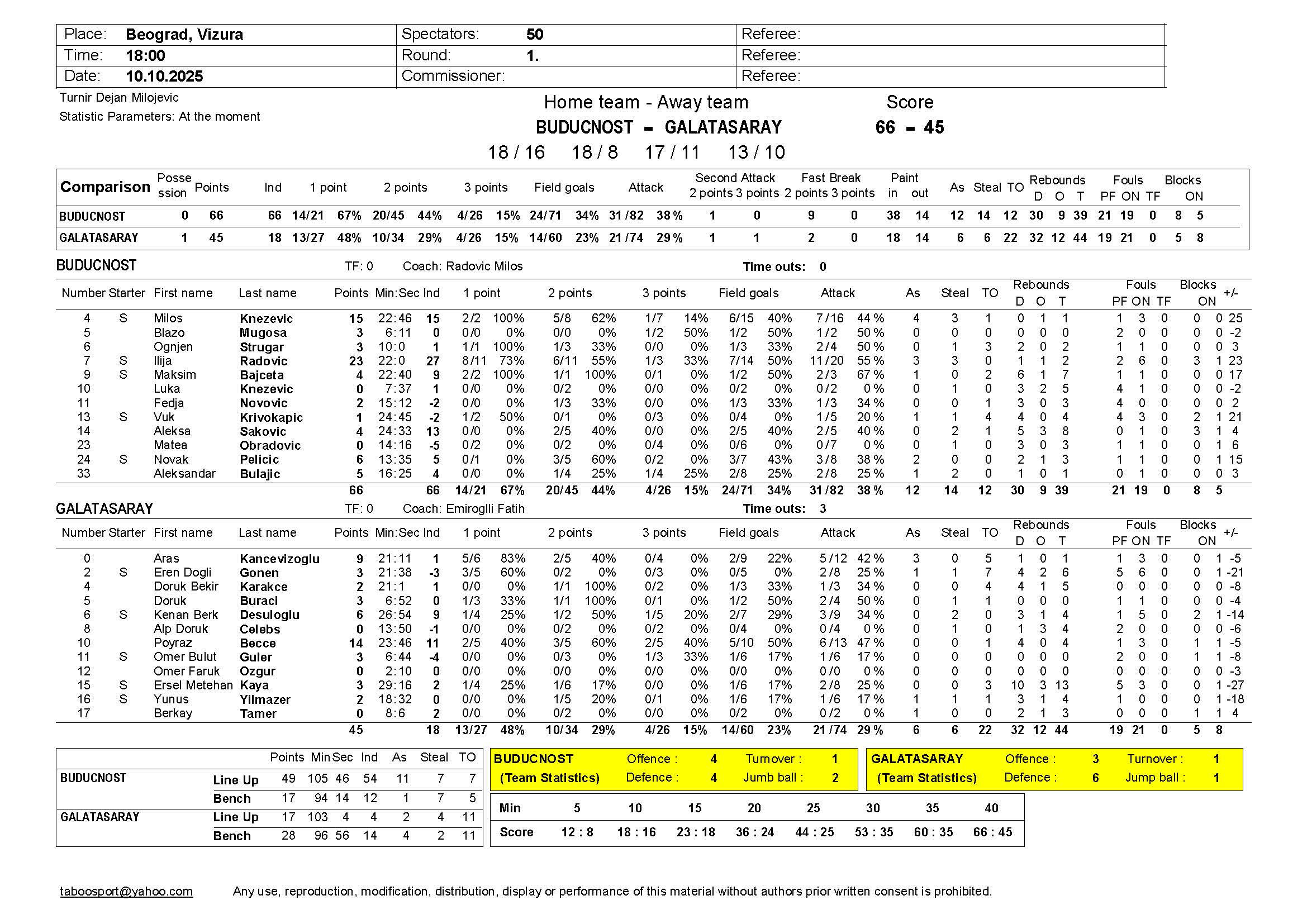 18:00 | Budućnost - Galatasaray | 66:45 |